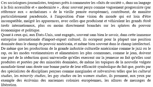 Cette tendance à importer des problématiques américaines ne se limite pas aux modes de vie ou à la consommation. Les débats intellectuels et politiques en France sont également influencés par des concepts venus des États-Unis, comme ceux liés à la race et aux minorités. Pierre Bourdieu, dans ses écrits, dénonçait déjà cette appropriation des problématiques américaines, soulignant les dangers d'une telle transposition dans un contexte français fondamentalement différent.