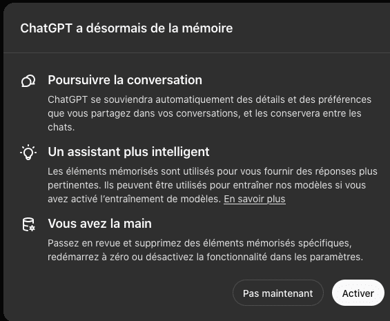 Une avancée majeure a été réalisée : ChatGPT dispose désormais d'une mémoire globale