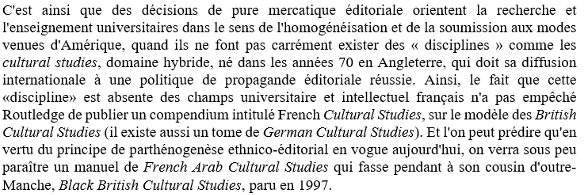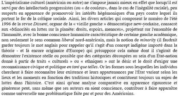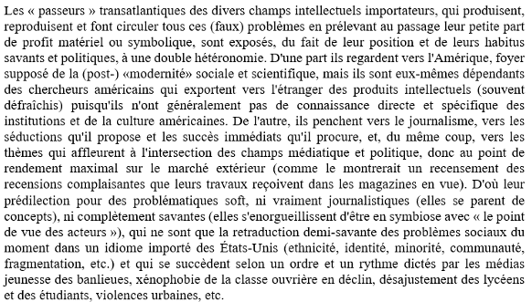 Cette tendance à importer des problématiques américaines ne se limite pas aux modes de vie ou à la consommation. Les débats intellectuels et politiques en France sont également influencés par des concepts venus des États-Unis, comme ceux liés à la race et aux minorités. Pierre Bourdieu, dans ses écrits, dénonçait déjà cette appropriation des problématiques américaines, soulignant les dangers d'une telle transposition dans un contexte français fondamentalement différent.