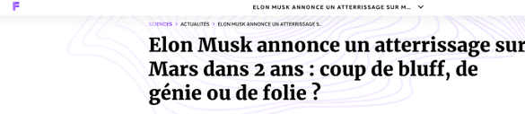 Futura Sciences : « Elon Musk annonce un atterrissage sur Mars dans 2 ans : coup de bluff, de génie ou de folie ? »