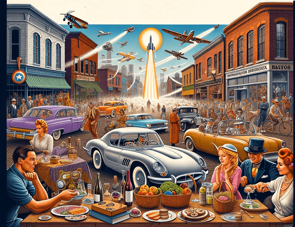 En opposant cette époque arcadienne à l’esprit utopiste des décennies passées, on remarque une rupture fondamentale : si de 1945 à 1975, le monde occidental rêvait de progrès, de voyages spatiaux et de voitures volantes, aujourd'hui, c’est le passé qui nous fascine. Nous nous drapons dans les habits d’un temps révolu, nous réinventons à coups de vinyles, de modes vintages et de marketing pseudo-authentique. La montée des produits artisanaux et locaux, la culture du vin naturel, des reconstitutions historiques, des marchés fermiers, des recettes traditionnelles, réutilisation incessante d’anciens récits comme les remakes de films ou des classiques littéraires…