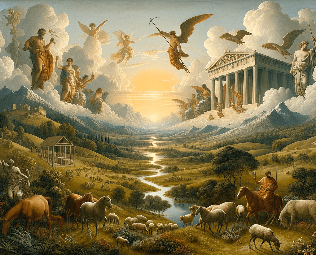 L'Arcadie, dans la mythologie grecque, fait référence à la patrie du dieu Pan, un espace où la nature sauvage règne en maîtresse. Au fil du temps, particulièrement à la Renaissance, elle a été réinterprétée dans les arts comme un refuge pastoral, symbole d'une société harmonieuse, en équilibre avec elle-même et son environnement, loin des corruptions et des excès de la civilisation moderne.
