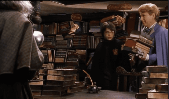 Gilderoy Lockhart s’apprêtant à donner sa collection de livres à Harry sous l’œil de la caméra